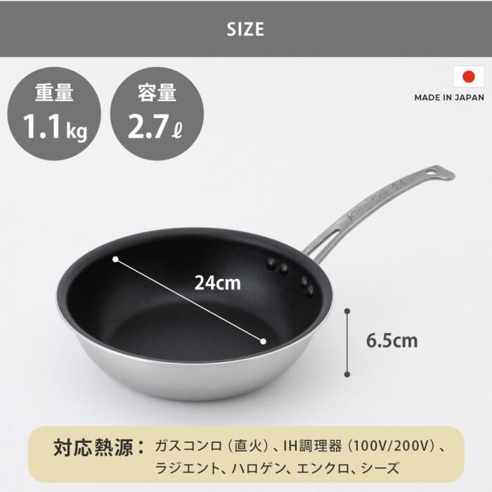 フライパンの材質には高効率ステンレスと極厚アルミの合金を使用しており、IH・ガス共にご使用が可能です。