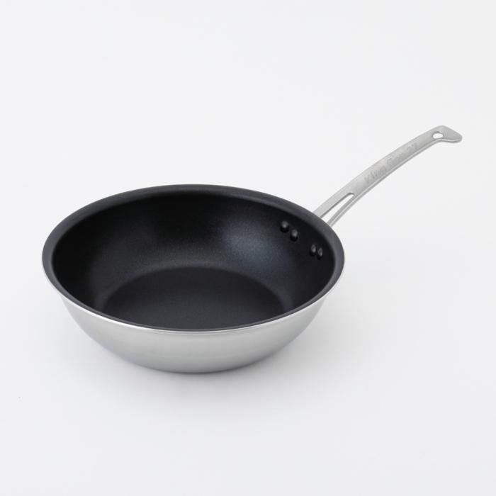 フライパン側面は磁力の反応に優れ耐食性の高い445M2ステンレス材を全面に使用。また、あいだには極厚2.6mmのアルミ材をはさむことにより熱ムラが少なく、側面までしっかり加熱されます。そのため、オムレツやパンケーキもきれいに仕上がります。