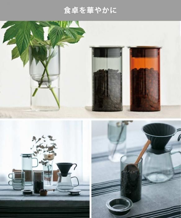ハリオ カラーズ キャニスター HCN-400-AB/HCN-400-GR 送料無料 分類で探す キッチングッズ キッチン小物 保存容器 キャニスター ブランドで探す ハリオ HARIO 価格帯(税込) 2,000円台の商品 キッチン 送料無料 ラッピング承ります フタが透明で中を確認できる耐熱ガラス製キャニスター フタにはシリコーンパッキンが付いているので コーヒー豆・粉 茶葉の保存におすすめです 中の様子が見える透明ガラスの蓋 hario-hcn-400 2,750円(税込)0円 在庫入荷待ちアンバー2,750円(税込)在庫なし2,750円(税込)在庫なしグレー2,750円(税込)在庫なし2,750円(税込)在庫なし SOLD OUT 製品について性能詳細お買い物ガイドクロッカについてフタが透明で中を確認できる耐熱ガラス製キャニスター 耐熱ガラス製キャニスター。本体はカラーガラスなので遮光性があり、またフタにはシリコーンパッキンが付いているので、コーヒー豆・粉、茶葉の保存にもおすすめです。キャニスターのフタは透明ガラスなので上から中の状態を見ることができます。 食卓に彩りを添えるアンバーカラーとグレーカラーからお選びいただけます。 サイズ径8 × 高14.3cm 実用容量400ml 重量約235g 材質本体:耐熱ガラス(耐熱温度差120℃)フタ,フィルター:ポリプロピレン(耐熱温度140℃)パッキン:シリコーンゴム(耐熱温度差180℃) 生産国本体:中国パッキン:ベトナム日本で品質管理し、組み立てを行っております。 備考○ 食器洗浄乾燥機使用可○ お手入れの際は研磨剤入りたわし、金属たわしやクレンザーなどを使用しないでください。 製造元HARIO ハリオRERATED ITEMS関連商品カイコ ポット 1.1Lトスカ マグネットコーヒーペーパーフィルターホルダー 2976タワー マグネットコーヒーペーパーフィルターホルダー 2977
