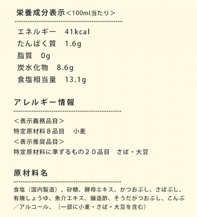 「白だし」の1.5倍のだし素材でリッチな味わいを実現。国内製造鰹節、さば節、宗田鰹節、北海道産昆布の合わせだしを使用しています。
