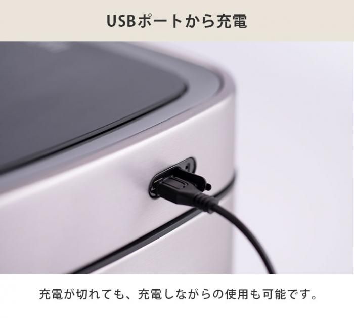 手をかざすだけでフタが自動開閉。USB充電式でコンセント不要。充電しながらの使用も可能です。