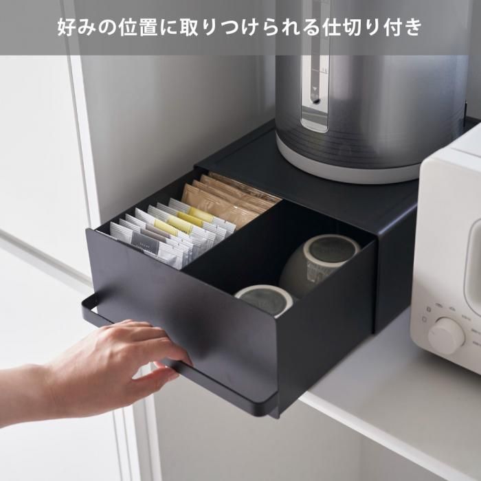 タワー 引き出し付きキッチン家電下ラック 2018/2019 送料無料 分類で探す キッチングッズ キッチン収納 すき間収納 ブランドで探す 山崎実業 タワー tower 価格帯(税込) 4,000円台の商品 キッチン用品 送料無料 ラッピング承ります 電気ケトルやコーヒーメーカーの下を有効活用 引き出し付きなので小物も収納できるキッチン家電下ラック ミキサーやコーヒーメーカーなど様々なキッチン家電をのせられますtower-2018-9 4,840円(税込)0円 在庫入荷待ちホワイト4,840円(税込)4,840円(税込)ブラック4,840円(税込)在庫なし4,840円(税込)在庫なし 数量 カートに入れる 製品について性能詳細お買い物ガイドクロッカについて様々なキッチン家電をのせられ小物も収納できるキッチン家電下ラック 電気ケトルやコーヒーメーカーの下を有効活用。引き出し付きなので小物も収納できるキッチン家電下ラック。引き出しの中にシュガーや紅茶パックなどを一括収納できます。マグネットでお好みの位置に取り付けられる仕切り付き。ミキサーやコーヒーメーカーなど様々なキッチン家電をのせられます。 材質本体:スチール(粉体塗装)、ポリプロピレン仕切り板:スチール(粉体塗装)、マグネット サイズ約W22.2×D27.5×H11.5cm(取っ手を含む) 内寸サイズ上段(凹み部分):約W18.5×D23cm引き出し:約W21×D24.5×H10.3cm(仕切り板含まず) 重量約2800g 耐荷重約5kg 備考中国 ブランド 製造元tower -タワー 山崎実業RERATED ITEMS関連商品タワー ディッシュストレージ 7488/7489タワー 冷蔵庫横マグネット収納ポケット3段 4496/4497タワー スリム マグボトル&コップラック 5643/5644リン ティッシュ&トイレットペーパーケース 5469/5470タワー スリムプラスチックバッグケース 3976/3977タワー 隠せる調味料ラック 2段 4334/4335タワー ツーウェイ キッチン家電下引き出し&スライドテーブル 2007/2008タワー キッチン家電下スライドテーブル 2105/2106タワー ランチョンマットスタンド 1999/2000