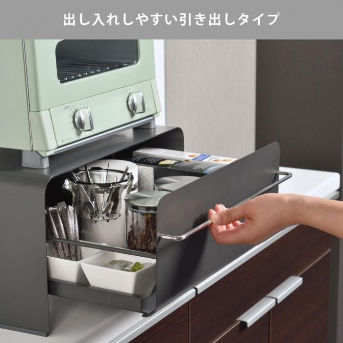 ラックの上にはトースターも置けて、スペースを有効活用できます。食パン1斤がまるごと入る大容量の引き出しにはトースター周りの小物を一括収納できます。