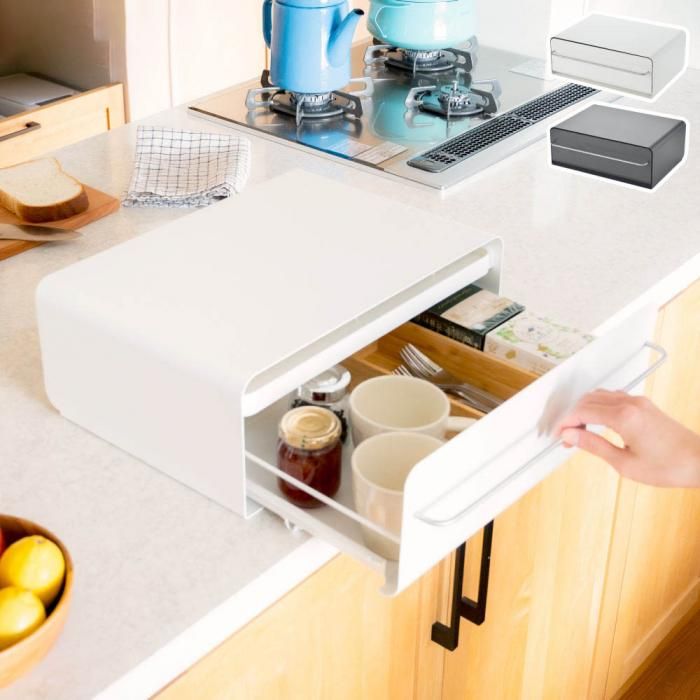 カウンター上に置きがちな小物類をまとめて収納。奥に収納した物も見えやすい、引き出し式の収納ケース。