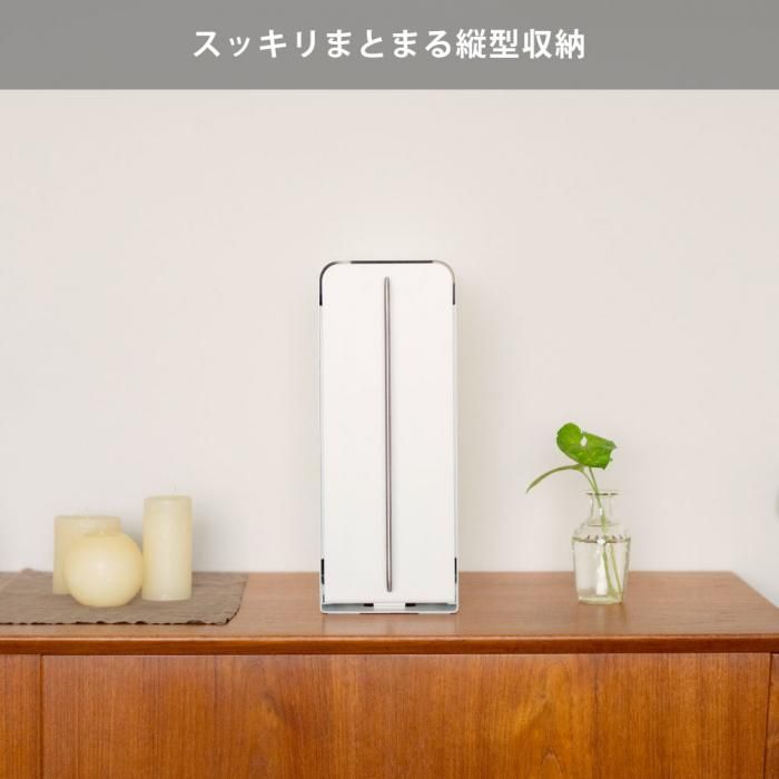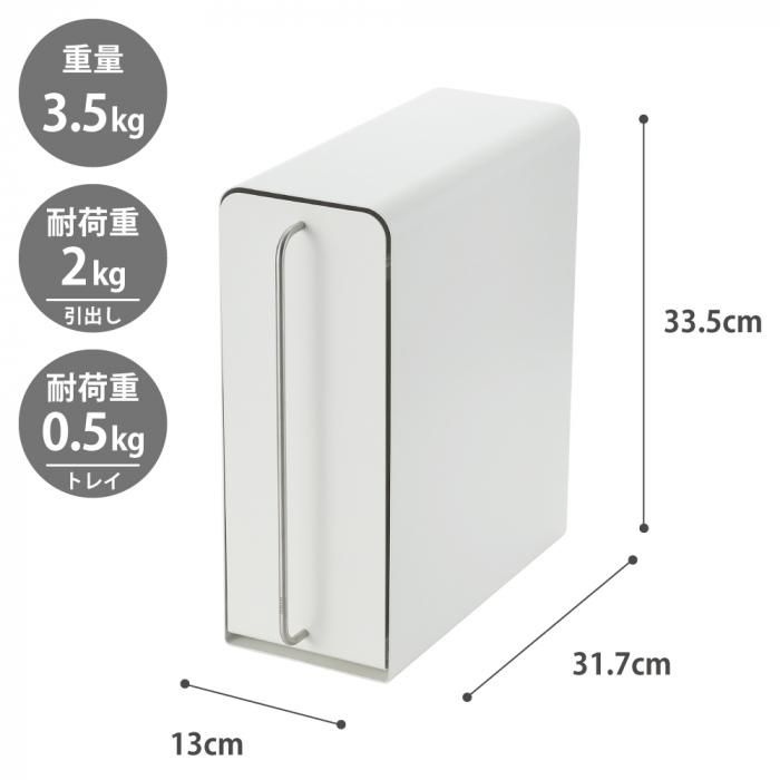 空きスペースに置きやすく、場所を取らない幅13cmのスリムサイズ。玄関の靴箱の上やキッチンのコンロサイド、洗面台の上などに置いて、生活感を隠して収納できます。