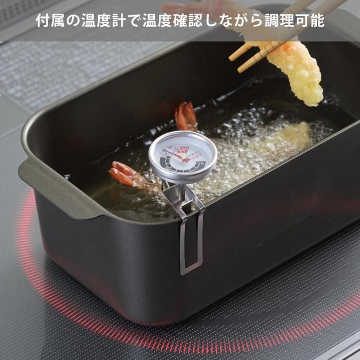 食彩亭 角型蓋付天ぷら鍋 アミ・温度計付 TP-16 送料無料 分類で探す キッチングッズ 鍋 天ぷら鍋 ブランドで探す タマハシ 価格帯(税込) 3,000円台の商品 キッチン用品 送料無料 ラッピング承ります 少ない油で長さのある食材も揚げやすい長角型の天ぷら鍋です 保管に便利なフタは調理時にはバットとして使用でき 付属の温度計で油の温度を確認しながら調理ができますtamahashi-tp16 3,300円(税込)0円 在庫入荷待ち角型蓋付天ぷら鍋(アミ・温度計付)3,300円(税込)3,300円(税込)在庫なし 数量 カートに入れる 製品について性能詳細お買い物ガイドクロッカについてコンパクトなのに、なが〜い食材も調理しやすい角型天ぷら鍋 少量の油でも長い食材が揚げられる!保管に便利な蓋付。丸鍋では揚げにくい、エビやアスパラなど長さのある食材も揚げやすい長角型。保管に便利なフタは調理時にはバットとして使用でき、二役こなせます。ツマミが無い分収納時もコンパクトです。付属の温度計で油の温度を確認しながら調理ができます。ガス火・IH電磁調理器100V・200V対応。 サイズ約240×180×93mm(満水容量1,900ml・適正油量700ml)深さ:82mm寸法:20×12cm(内径) 重量約750g 材質・仕様本体:鉄(シリコン焼付け塗装)底の厚さ:1.2mm蓋:鉄(シリコン焼付け塗装)アミ:鉄(クロムめっき) 生産国中国 備考天ぷら・揚げ物専用 サイズ鍋本体のみ 鍋 + アミ・温度計製造元タマハシRERATED ITEMS関連商品富士ホーロー 天ぷら鍋 24cm TP-24富士ホーロー よくばり天ぷら鍋富士ホーロー 天ぷら鍋・オイルポット・網付きホーロー容器 調理器具3点セット富士ホーロー 片手天ぷら鍋 16cm C-16STP極ジャパン 天ぷら鍋 S 20cm 揚げ網付き極ジャパン 天ぷら鍋 M 24cm 菜箸・揚げ網付き