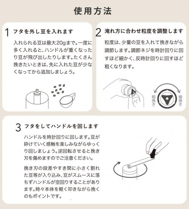 またセラミック製の刃は錆びることがなく、摩擦熱が出にくいので豆本来の味を損なわずに挽くことができます。