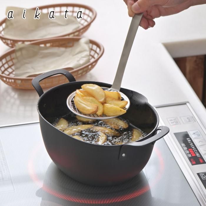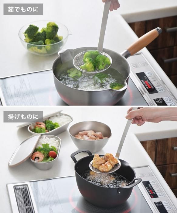 丈夫なステンレス製で茹で物、揚げ物のどちらにも使用できます。たっぷりとすくい上げられるアミと長めのハンドルで安心してお料理ができます。