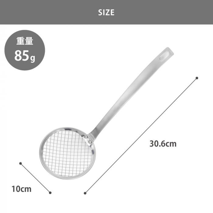 ●茹でものや揚げものもすくえて、湯切れ、油切れの良いメッシュタイプ。