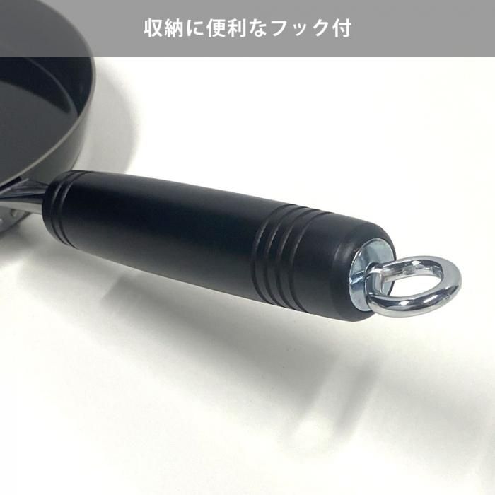 握りやすい角度に調整された取っ手。黒い木柄は、焦げついても目立ちにくい。