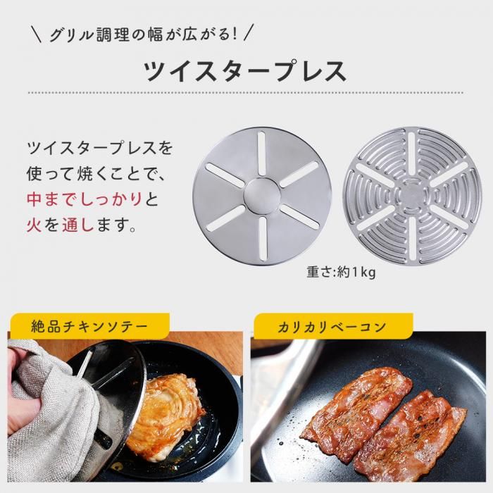 ステンレス製鋳物(重さ約1kg)のツイスタープレスを使って焼くことで、調理面にある「スリット」と「突起」が蒸気対流を起こして肉汁を循環させながら、余分な水分と油を飛ばします。生焼けになりにくく、肉の中までしっかりと火を通します。