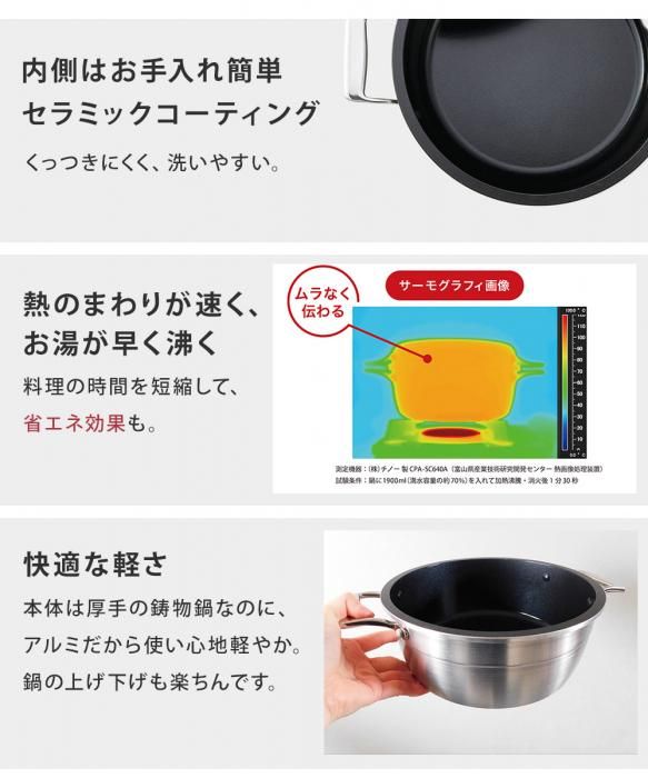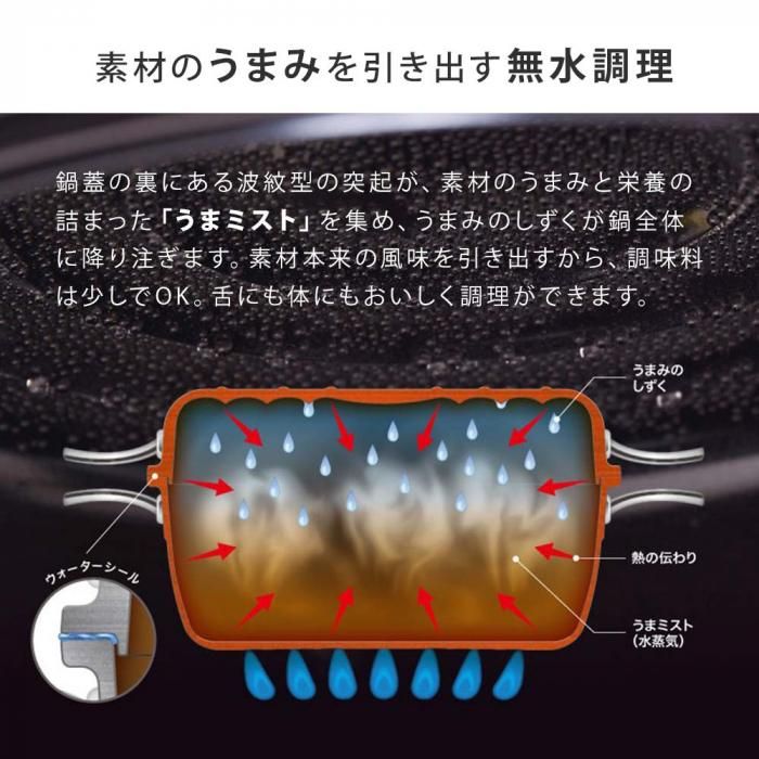 鍋蓋の裏にある波紋型の突起が、素材のうまみと栄養の詰まった「うまミスト」を集め、うまみのしずくが鍋全体に降り注ぎます。素材本来の風味を引き出すから、調味料は少しでOK。舌にも体にもおいしく調理ができます。