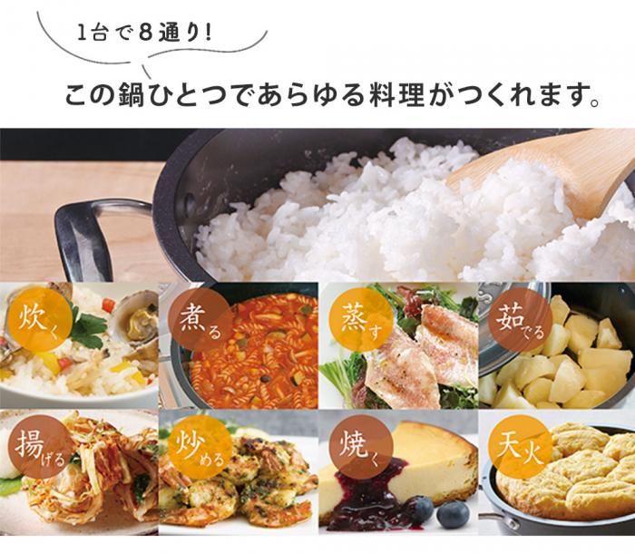 炊く・蒸す・茹でる・煮る・揚げる・炒める・焼く・オーブン調理 1台8役。鍋1つであらゆる料理が作れます。もちろんご飯もふっくら炊けます。