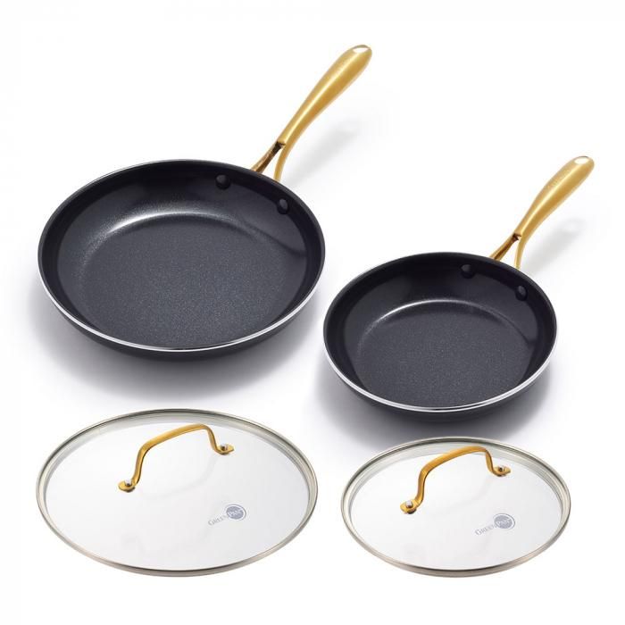 ストゥディオ フライパン 2点+ガラス蓋2点セット 送料無料 分類で探す キッチングッズ フライパン ブランドで探す グリーンパン ストゥディオ STUDIO 価格帯(税込) 2万円台の商品 キッチン用品 送料無料 ラッピング承ります ブラックカラー×落ち着いたゴールドカラーのハンドルが組み合わせられた「STUDIO ストゥディオ コレクション」 キッチンからテーブルまでその場の空間を華やかに彩ります greenpan-05083195 25,410円(税込) 0円 SOLD OUT 製品について性能詳細お買い物ガイドクロッカについて 食卓にそのままサーブしても華やかさがある大人スタイルのストゥディオ4点セット 新シリーズ「STUDIO(ストゥディオ)」は、クールなブラックのボディとゴールドハンドルを組み合わせた洗練したデザインのコレクション。他には見ないグリーンパンらしいデザインです。 ハンドルが熱くなりにくいV字のフレームガード。ビス止めの部分までもデザインされています。ハンドルはステンレスハンドルにゴールドのPVD加工を施しています。 また、見た目とは異なり非常に軽く、ハンドルも丸みがあるので握りやすく、若い方からご年配の方まで幅広い年齢層の方向けの商品です。 ブラックのボディとゴールドのハンドルの上品なデザインは調理後そのまま食卓にサービングするのもおすすめです。 サーモロン・セラミックコーティング 青りんごが目印の「サーモロン」は、グリーンパンがノンスティック(こびりつき防止)加工に採用しているセラミックコーティングであり、特許を取得しています。サーモロンは、フッ素樹脂(PTFE)を使用せず、鉱物(ほとんどが砂由来)の素材をコーティング加工ができるようゾルゲルという方法で溶液に変換しています。そのプロセスには、有害なPFAS、PFOA、鉛、カドミウムなど、人体や環境に影響を及ぼす化学物質は一切含まれていません。従来のノンスティック加工と比較して熱を均一に、素早く伝えるので、お料理を美味しく仕上げます。また、優れたノンスティック効果で、こびりつきにくく、お手入れも簡単です。 マグニートIH 対応加工(底面) マグニートは、アルミニウム製のフライパンをIH対応にするためにグリーンパンが採用した独自のテクノロジー。電磁誘導粉末の層をアルミニウム底に装着して、磁気をもたせる技術のことです。ステンレスの板を貼ってないので、非常に軽く扱いやすいです。マグニートIH対応テクノロジーが駆使されたフライパンは、この層を底面全体に閉じ込めているので安定感が抜群。熱変形に強く、熱伝導性に優れています。IH はもちろん、ガス火やさまざまな熱源に対応しています。 サイズフライパン20cm:全長38.2×幅21×高さ6.6×深さ3.8cm / 522gフライパン26cm:全長47.2×幅27.1×高さ7.8×深さ4.2cm / 769gガラス蓋20cm:全長21.3×幅21.3cm / 406gガラス蓋26cm:全長26.8×幅26.8cm / 678g 材質本体:アルミニウム合金表面加工(内面、外面):セラミックコーティングハンドル:ステンレス鋼蓋:強化ガラス(全面物理強化)、ステンレス鋼 対応熱源ガスコンロ、IH(100V/200V)、ラジエント、ハロゲン、オーブン 生産国中国 備考 食器洗浄乾燥機使用不可 オーブン使用可(ガラス蓋は不可) 調理(炒め物・焼き物)をする際は、必ず中火で30 秒〜1分程度、予熱してください。鍋が温まったところに少量の油かバターを入れてから調理をはじめてください。 熱伝導・熱保有率に優れているため、弱火〜中火での調理をおすすめいたします。 RERATED ITEMS関連商品モコミチハヤミ ビタクラフト ウォックパン 26cm貝印 o.e.c. minima 3点セット DY5209