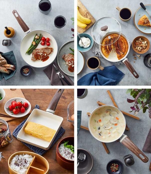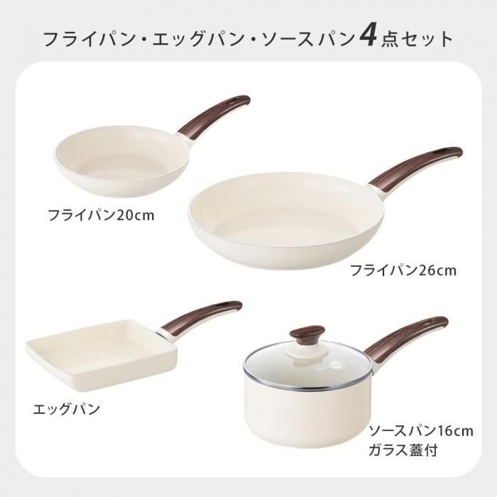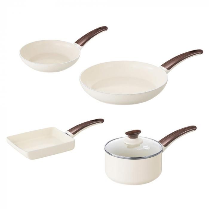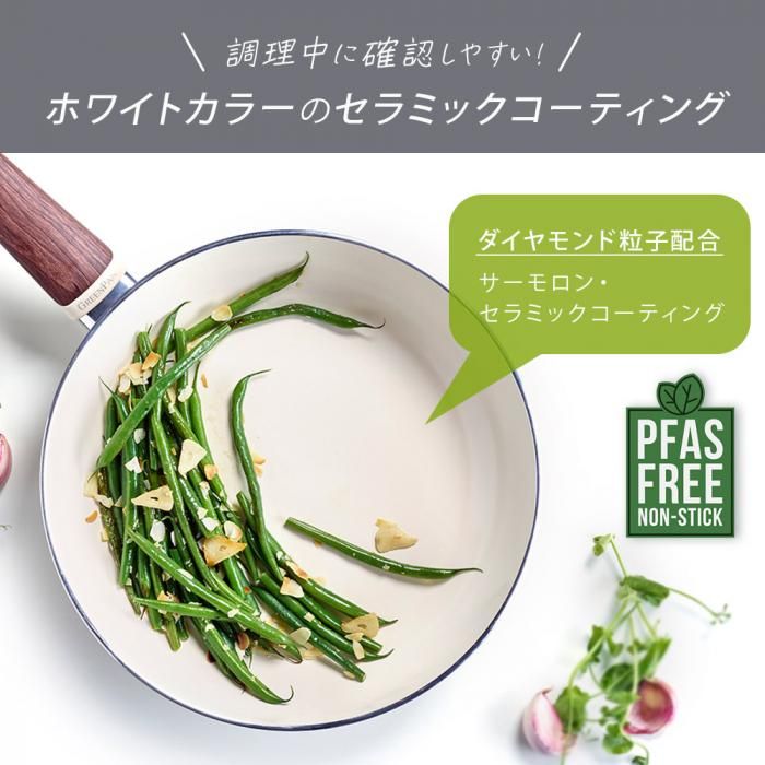 ウッドビー フライパン・エッグパン・ソースパン 4点+ガラス蓋1点セット 送料無料 分類で探す キッチングッズ フライパン ブランドで探す グリーンパン ウッドビー WOODBE 価格帯(税込) 3万円以上の商品 キッチン用品 送料無料 ラッピング承ります 昼の森をイメージしたホワイトカラーに ウッド調の樹脂ハンドルを組み合わせたウッドビーフライパン 温かみのあるナチュラルなデザインが魅力です greenpan-05083199 34,870円(税込)0円 SOLD OUT 製品について性能詳細お買い物ガイドクロッカについて温かみのあるナチュラルなデザインが魅力のウッドビー4点セット 昼の森をイメージしたホワイトカラーに、ウッド調の樹脂ハンドルを組み合わせた「WOOD-BE ウッドビー コレクション」。温かみのあるナチュラルなデザインが魅力です。 内面も外側もホワイトカラーのセラミックコーティングは、キッチンをナチュラルで明るい雰囲気に演出します。お料理の出来具合が確認しやすく、お皿に盛り付けた際のイメージもしやすいのもポイント。 内側にハンドルを接合するリベットが無いので、お手入れも簡単です。ハンドルは樹脂製です。 ○ サーモロン・セラミックコーティング 青りんごが目印の「サーモロン」は、グリーンパンがノンスティック(こびりつき防止)加工に採用しているセラミックコーティングであり、特許を取得しています。サーモロンは、フッ素樹脂(PTFE)を使用せず、鉱物(ほとんどが砂由来)の素材をコーティング加工ができるようゾルゲルという方法で溶液に変換しています。そのプロセスには、有害なPFAS、PFOA、鉛、カドミウムなど、人体や環境に影響を及ぼす化学物質は一切含まれていません。従来のノンスティック加工と比較して熱を均一に、素早く伝えるので、お料理を美味しく仕上げます。また、優れたノンスティック効果で、こびりつきにくく、お手入れも簡単です。 ○ マグニートIH 対応加工(底面) マグニートは、アルミニウム製のフライパンをIH対応にするためにグリーンパンが採用した独自のテクノロジー。電磁誘導粉末の層をアルミニウム底に装着して、磁気をもたせる技術のことです。ステンレスの板を貼ってないので、非常に軽く扱いやすいです。マグニートIH対応テクノロジーが駆使されたフライパンは、この層を底面全体に閉じ込めているので安定感が抜群。熱変形に強く、熱伝導性に優れています。IH はもちろん、ガス火やさまざまな熱源に対応しています。 サイズフライパン20cm:全長36.3×幅20.7×高さ6.5×深さ4.3cm / 590gフライパン26cm:全長44×幅26.7×高さ8×深さ4.7cm / 880gソースパン:全長32.3×幅16.6×高さ13.5cm×深さ8.2cm / 910gエッグパン:全長35×幅14.7×高さ6.3cm / 550g 材質本体:アルミニウム合金表面加工(内面、外面):セラミックコーティングハンドル:フェノール樹脂蓋:強化ガラス(全面物理強化)、フェノール樹脂 対応熱源ガスコンロ、IH(100V/200V)、ラジエント、ハロゲン 生産国中国 備考○食器洗浄乾燥機使用不可○調理(炒め物・焼き物)をする際は、必ず中火で30 秒〜1分程度、予熱してください。鍋が温まったところに少量の油かバターを入れてから調理をはじめてください。○熱伝導・熱保有率に優れているため、弱火〜中火での調理をおすすめいたします。○スチールウール製または研磨作用のあるナイロン製スポンジたわしのご使用はお控え下さい。○クリーナーや研磨剤を含んだ洗剤や塩素系漂白剤を含んだ洗剤は絶対にご使用にならないでください。○ノンスティック・コーティングを削らないでください。 RERATED ITEMS関連商品モコミチハヤミ ビタクラフト ウォックパン 26cm貝印 o.e.c. minima 3点セット DY5209