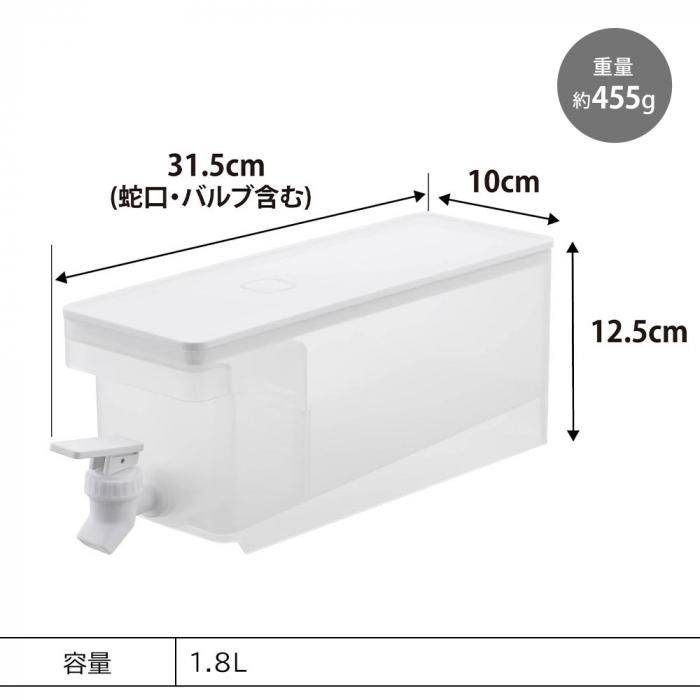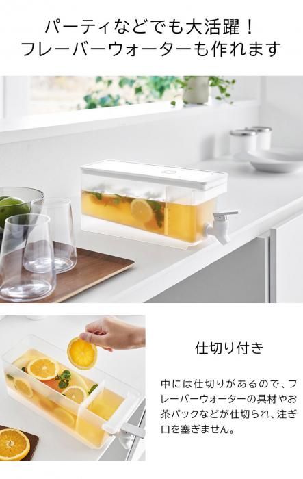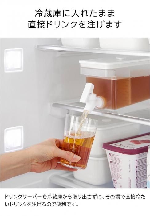 タワー 冷蔵庫ドリンクサーバー 1.8L 1584 送料無料 分類で探す キッチングッズ 食器・カトラリー コーヒー・お茶用品 茶ポット・冷水筒 ブランドで探す 山崎実業 タワー tower 価格帯(税込) 2,000円台の商品 キッチン 送料無料 ラッピング承ります レバーを上下に倒すだけで冷たいお茶を簡単に注げる冷蔵庫ドリンクサーバー キッチンカウンターに設置すれば いつでも手軽にお茶やフレーバーウォーターを飲むことができますtower-1584-5 2,750円(税込)0円 在庫入荷待ちホワイト2,750円(税込)2,750円(税込)在庫なしブラック2,750円(税込)2,750円(税込)在庫なし 数量 カートに入れる 製品について性能詳細お買い物ガイドクロッカについてレバーを上下に倒すだけで冷たいお茶を簡単に注げる冷蔵庫ドリンクサーバー レバーを上下に倒すだけで冷たいお茶を簡単に注げる冷蔵庫ドリンクサーバー。冷水筒を取り出さずに冷蔵庫から直接ドリンクを注げて便利。キッチンカウンターに設置すれば、いつでも手軽にお茶やフレーバーウォーターを飲むことができます。2.8Lの大容量でパーティなどでも大活躍。パーツは全て分解でき、洗うことができるので清潔に保てます。食洗機OK。 材質容器:メタクリルスチレン蓋、仕切り板、蛇口、キャップ:ポリプロピレンパッキン、バルブ:シリコーンレバー:ABS樹脂蛇口バネ:ステンレス鋼 サイズW10×D31.5×H12.5cm(蛇口、バルブ含む) 重量約455g 容量約1.8L 耐熱容器、レバー:90℃蓋、仕切り板、蛇口、キャップ、パッキン、バルブ:120℃ 耐冷容器、レバー、蓋、仕切り板、蛇口、キャップ、パッキン、バルブ:-40℃ 備考中国組立式 ブランド 製造元tower -タワー 山崎実業RERATED ITEMS関連商品及源鋳造 OIGEN南部鉄器 急須 たまご型 0.55L ステンレス茶こし付き(ピンク・グリーン・ブルー)タテヨコ スリムピッチャー 1.4Lタテヨコ スライドピッチャー 1.3Lタテヨコ ワンプッシュピッチャー 2.2L K-1284タテヨコ ワンプッシュピッチャー 1.2Lタテヨコ ラージピッチャー 3.0L