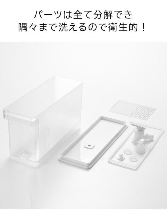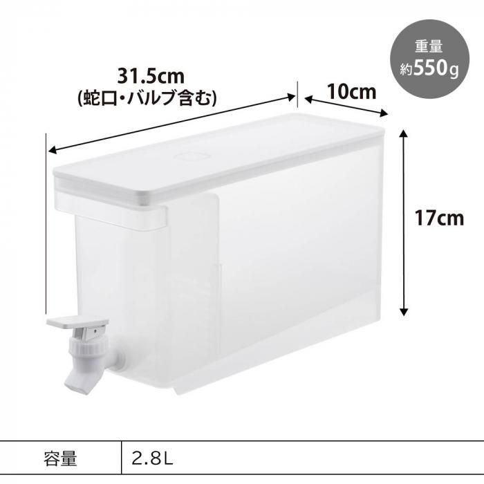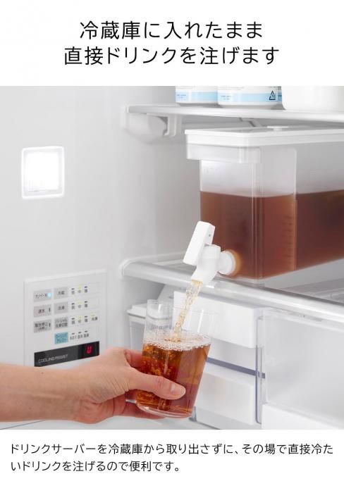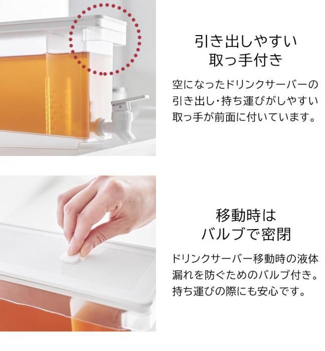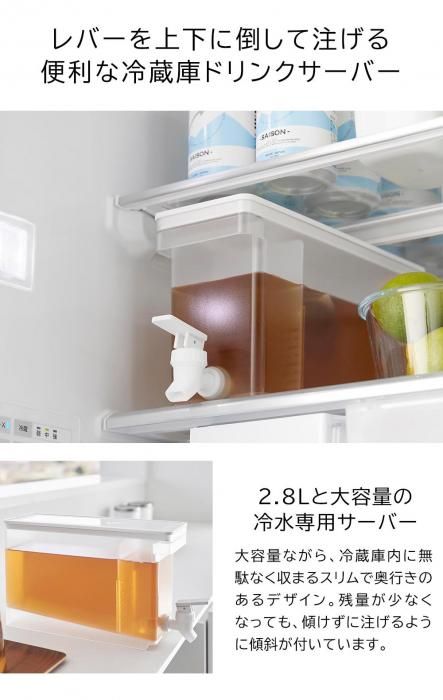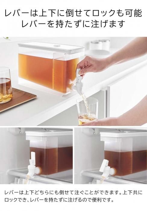 タワー 冷蔵庫ドリンクサーバー 2.8L 1582 送料無料 分類で探す キッチングッズ 食器・カトラリー コーヒー・お茶用品 茶ポット・冷水筒 ブランドで探す 山崎実業 タワー tower 価格帯(税込) 2,000円台の商品 キッチン 送料無料 ラッピング承ります レバーを上下に倒すだけで冷たいお茶を簡単に注げる冷蔵庫ドリンクサーバー キッチンカウンターに設置すれば いつでも手軽にお茶やフレーバーウォーターを飲むことができます tower-1582-3 2,970円(税込) 0円 在庫入荷待ちホワイト2,970円(税込)在庫なし2,970円(税込)在庫なしブラック2,970円(税込)在庫なし2,970円(税込)在庫なし SOLD OUT 製品について性能詳細お買い物ガイドクロッカについて レバーを上下に倒すだけで冷たいお茶を簡単に注げる冷蔵庫ドリンクサーバー レバーを上下に倒すだけで冷たいお茶を簡単に注げる冷蔵庫ドリンクサーバー。冷水筒を取り出さずに冷蔵庫から直接ドリンクを注げて便利。キッチンカウンターに設置すれば、いつでも手軽にお茶やフレーバーウォーターを飲むことができます。2.8Lの大容量でパーティなどでも大活躍。パーツは全て分解でき、洗うことができるので清潔に保てます。食洗機OK。 材質容器:メタクリルスチレン蓋、仕切り板、蛇口、キャップ:ポリプロピレンパッキン、バルブ:シリコーンレバー:ABS樹脂蛇口バネ:ステンレス鋼 サイズ約W10×D31.5×H17cm(蛇口、バルブ含む) 重量約550g 容量約2.8L 耐熱容器、レバー:90℃蓋、仕切り板、蛇口、キャップ、パッキン、バルブ:120℃ 耐冷容器、レバー、蓋、仕切り板、蛇口、キャップ、パッキン、バルブ:-40℃ 備考中国組立式 サイズ1.8L 2.8Lブランド 製造元tower -タワー 山崎実業RERATED ITEMS関連商品及源鋳造 OIGEN南部鉄器 急須 たまご型 0.55L ステンレス茶こし付き(ピンク・グリーン・ブルー)タテヨコ スリムピッチャー 1.4Lタテヨコ スライドピッチャー 1.3Lタテヨコ ワンプッシュピッチャー 2.2L K-1284タテヨコ ワンプッシュピッチャー 1.2Lタテヨコ ラージピッチャー 3.0L