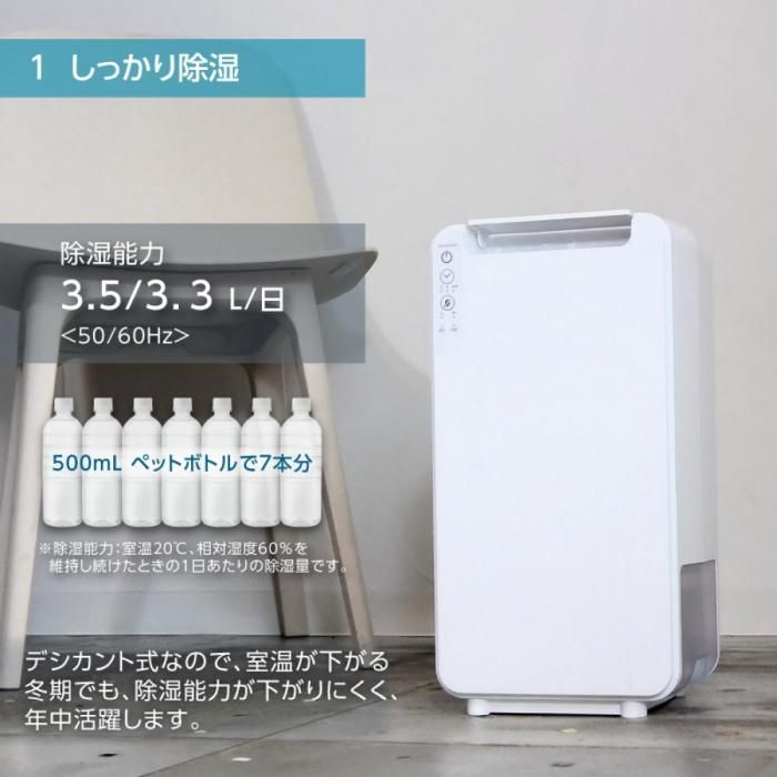 ○ コンパクトボディで除湿能力3.5L/日のしっかり除湿
