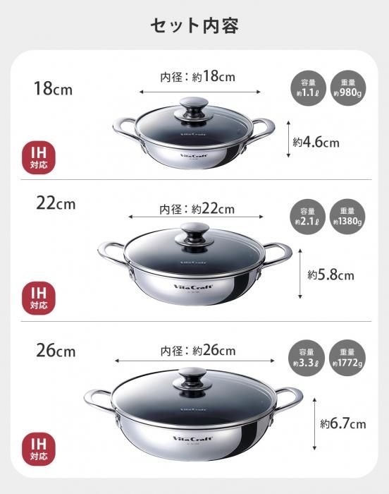 サイズ:内径22cm 外径23.8cm 深さ5.8cm 全高(蓋ツマミまでの高さ)11.0cm 全幅32.6cm