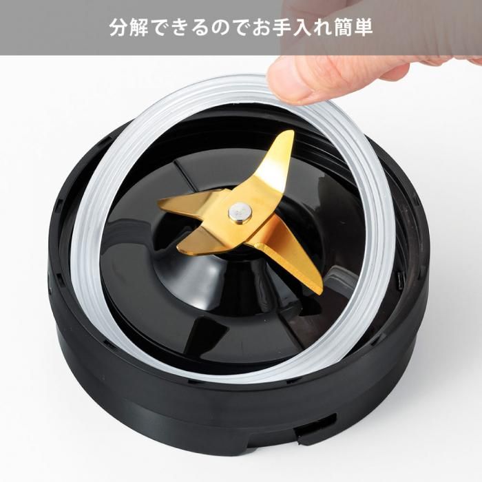コンパクトサイズながらも300Wのパワーを持ち、カッターもチタンコートの4枚刃を採用。ボトルがモーター本体に正しく装着されていない場合は、スイッチがONになっても作動しない安全設計です。