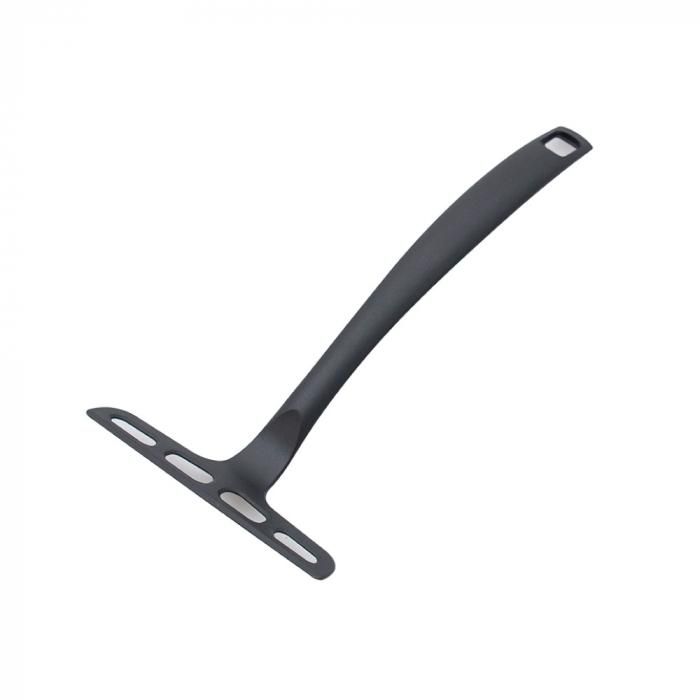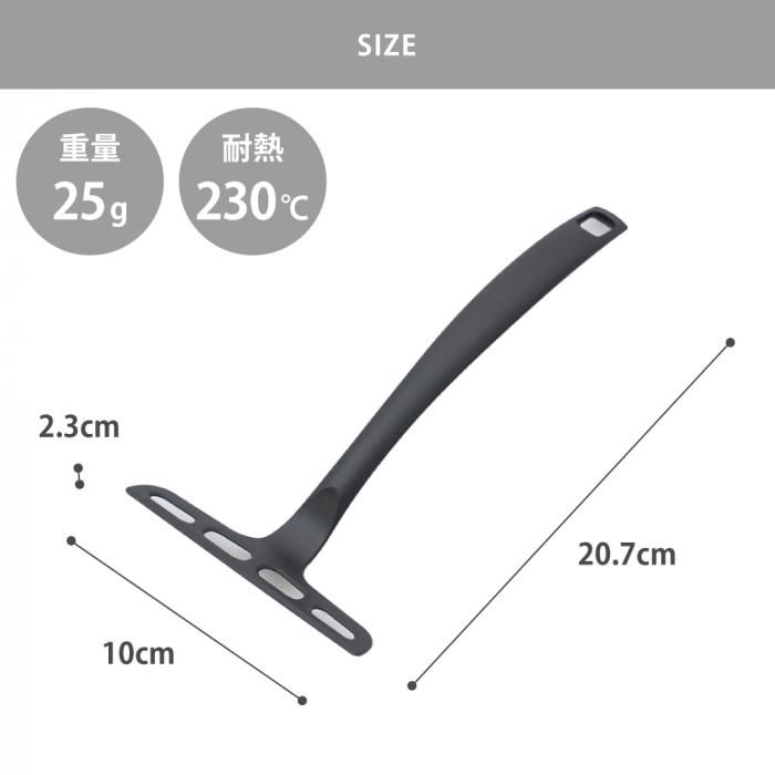 ナイロン卵焼きターナーの横幅は約10cm。一般的な卵焼きフライパン(横幅12〜14cm)に丁度使いやすい幅広タイプです。