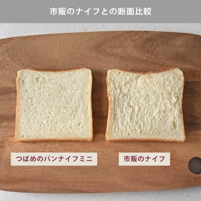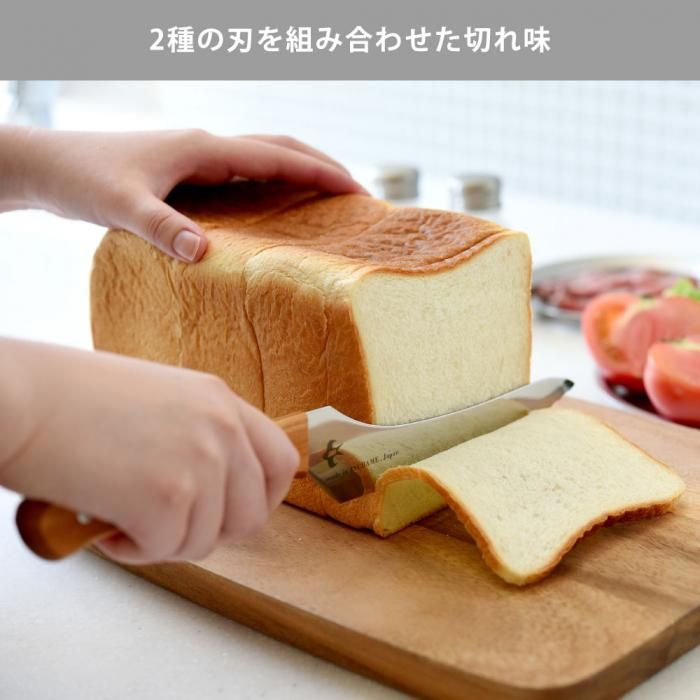 波刃と直刃の2種類の刃の組み合わせによりパンの切りくずを抑えながらきれいに切り分けられる短いパンナイフ。波刃のきっかけにより硬いフランスパンも、刃が入らずに潰れやすい柔らかい食パンも簡単に切れます。