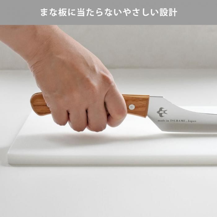 手になじむ天然のケヤキを使用。切ったときにまな板に指が当たらない安心形状。