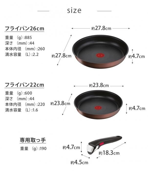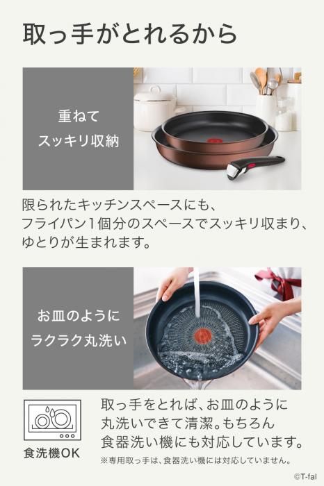 ティファールが特許を持つ3点固定システムでしっかりと取っ手を固定。着脱も片手でワンタッチで簡単。