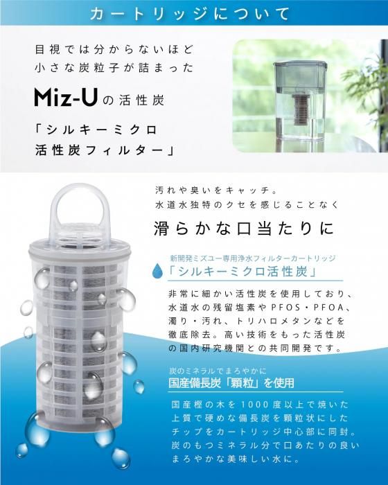 非常に微細な活性炭の力で水道水の残留塩素やトリハロメタン、汚れや臭いを徹底除去。まるで天然水のような飲み心地を実現しました。