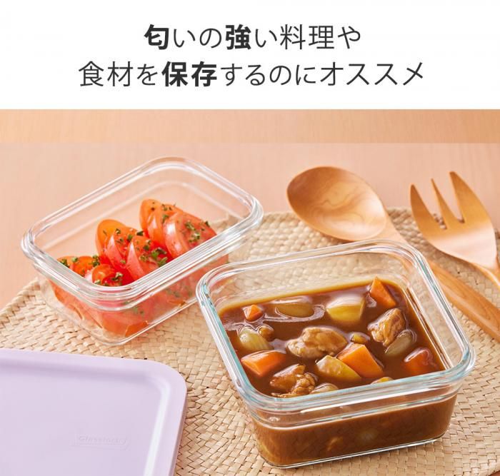 積み重ねできるシンプルな形状で、冷蔵庫や冷凍庫の収納もスムーズ。ガラスはニオイ移りがないため、余ったカレーなど匂いの強い料理や食材の保存に最適で、作り置きや常備菜の保存にも便利です。