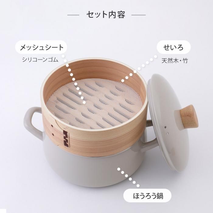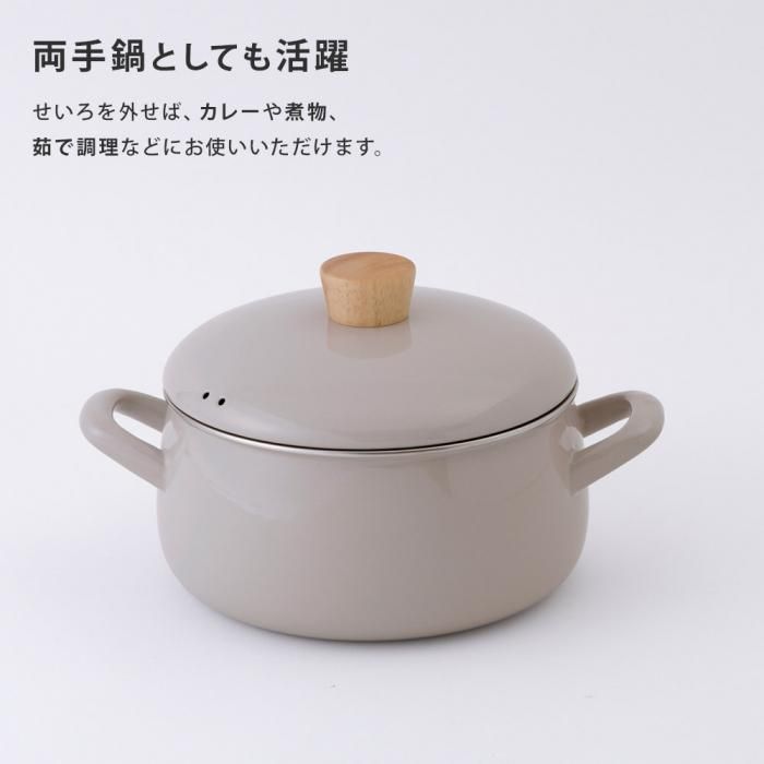 せいろ付きホーロー鍋 20cm 富士ホーロー ガス火 IH対応 1段 2段 シリコンメッシュシート SER-20W 送料無料 ブランドで探す 富士ホーロー 価格帯(税込) 6,000円台の商品 キッチン用品 送料無料 ラッピング承ります 竹製せいろがセットになったホーロー鍋 20cm 食材のこびり付きを防ぐシリコーンメッシュシートが付属しています ホーロー蓋付きで通常の両手鍋としても使用できます fuji-ser20w 6,600円(税込) 0円 在庫入荷待ちホワイト1段6,600円(税込)6,600円(税込)在庫なしグレージュ1段6,600円(税込)6,600円(税込)在庫なしホワイト2段8,250円(税込)8,250円(税込)在庫なしグレージュ2段8,250円(税込)8,250円(税込)在庫なしせいろ20cm単品1,650円(税込)1,650円(税込)在庫なし 数量 カートに入れる 製品について性能詳細お買い物ガイドクロッカについて 竹製せいろがセットになったホーロー鍋 竹製せいろがセットになったホーロー鍋。食材のこびり付きを防ぐシリコーンメッシュシートが付属しています。蒸気で加熱することにより、食材本来の味が際立ちます。素材の天然木と竹が調理中の余分な水気を適度に吸収し、蒸気が食材をやさしく包み込むように、ふんわりと蒸し上げます。本格的な蒸し料理をお楽しみいただけます。 食材の下に、本品に付属のメッシュシートや、市販のクッキングシート、葉物野菜等を敷くと、取り出しの際に食材のこびり付きを防止できます。付属のメッシュシートは洗って繰り返しご使用いただけます。 せいろをセットしないで通常の両手鍋としても使用できます。カレーやシチューなどの煮込み調理や茹で調理などに適しています。均一な熱伝導により、料理をムラなく美味しく仕上げます。4人分程度のスープやシチューを作るのに十分な容量です。 食卓にそのまま出してもかわいいデザインです。 ガラス質のホーローは食材のニオイ移りや色移りを気にせず調理することができます。また金属イオンが発生しないため、食材の風味を損ねることなく美味しく仕上がります。心材が鉄なので、ガス火でもIH調理器でも、熱効率よく調理できます。弱い火力で煮込むことができるので経済的です。コンパクトなハンドルなので、フタを外してオーブンにも入れられます。 せいろ付きホーロー鍋20cmはこちら サイズ鍋:W28.0×D21.0×H22.5cm / 約1430gせいろ:W20.0×D20.0×H7.5cm / 約210g 容量満水容量 2.9L(使用目安 7割程度の水位でご使用ください。) 材質本体,蓋:ほうろう用鋼板(底の厚さ 1.0mm)、ステンレスリング巻き蓋つまみ:天然木せいろ:天然木(竹)メッシュシート:シリコーンゴム 対応熱源ガスコンロ(直火),IH調理器(100V/200V),シーズ,ハロゲン,ラジエント 生産国鍋:タイ、せいろ:中国 ホーローについて 手作業で釉薬を掛けるため、ひとつひとつの表情には多少の個体差が生じます。 ホーローの性質上、焼成時に黒点や色むらの様に見える部位が生じる場合がございます。 鋼板の切り口となる部分は釉薬がかかりにくく、下地の黒いスジが多少見られますが黒い部分もホーロー加工が施されております。上記の様な場合でも不良ではなくご使用には問題ございませんので安心してお使い下さい。 備考 電子レンジ使用不可 鍋本体のみ食洗機使用可 サイズ18cm 20cm製造元富士ホーロー -ふじほうろうふじほーろー