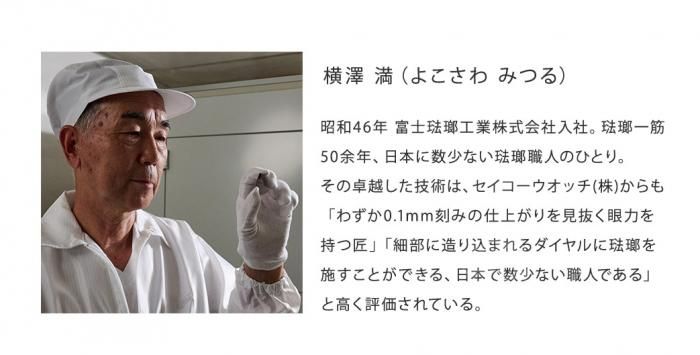その卓越した技術は、セイコーウオッチ(株)からも「わずか0.1mm刻みの仕上がりを見抜く眼力を持つ匠」「細部に造り込まれるダイヤルに琺瑯を施すことができる、日本で数少ない職人である」と高く評価されている。
