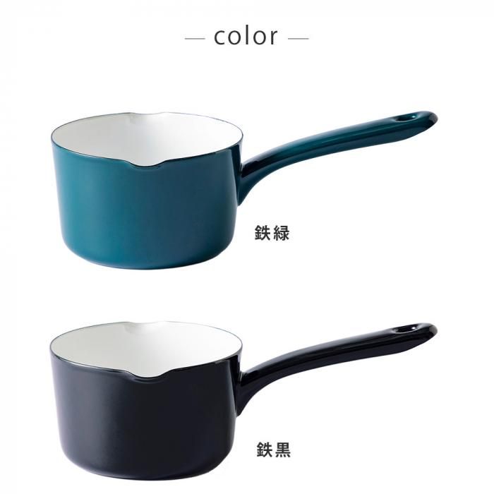 ホーロー独特の柔らかい光沢が生み出す温かみのある質感を持ち、見る角度により色が変わって見える、鉄色(鉄緑・鉄黒)の深い色合いが特長です。