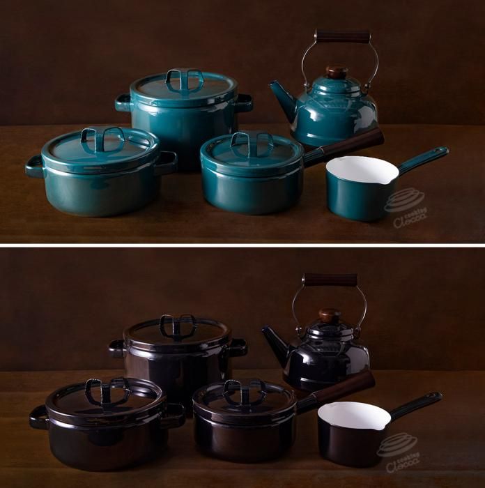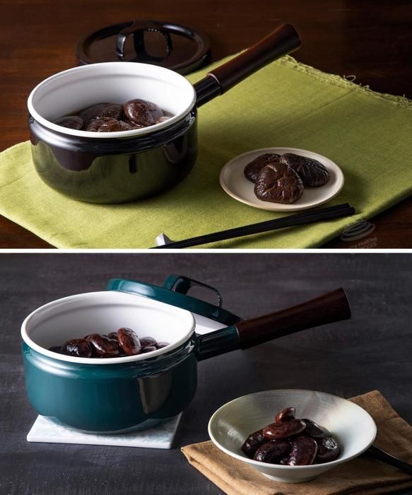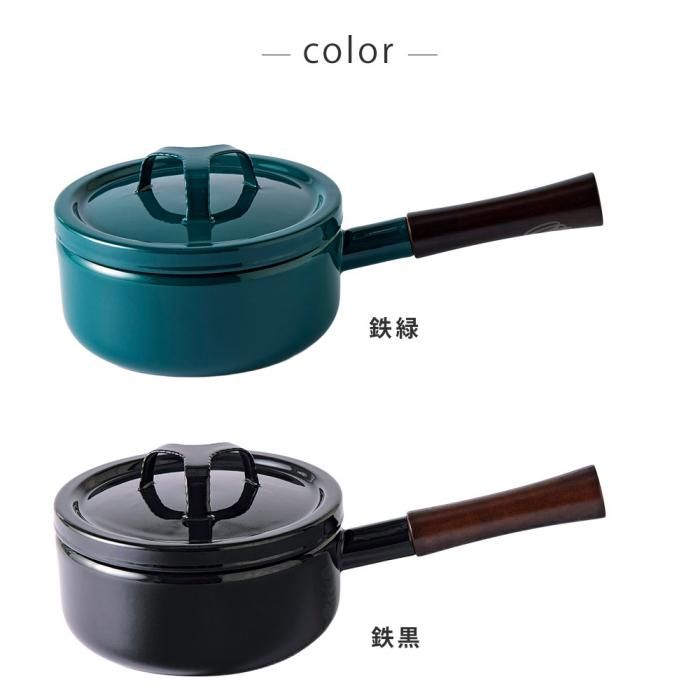 ホーロー独特の柔らかい光沢が生み出す温かみのある質感を持ち、見る角度により色が変わって見える、鉄色(鉄緑・鉄黒)の深い色合いが特長です。