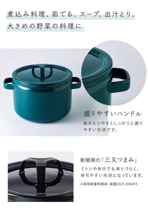 蓋には新開発の「三又ツマミ」を採用。従来、琺瑯を施すのが難しかった端面を凸凹にすることにより、琺瑯層の密着度を高めています。