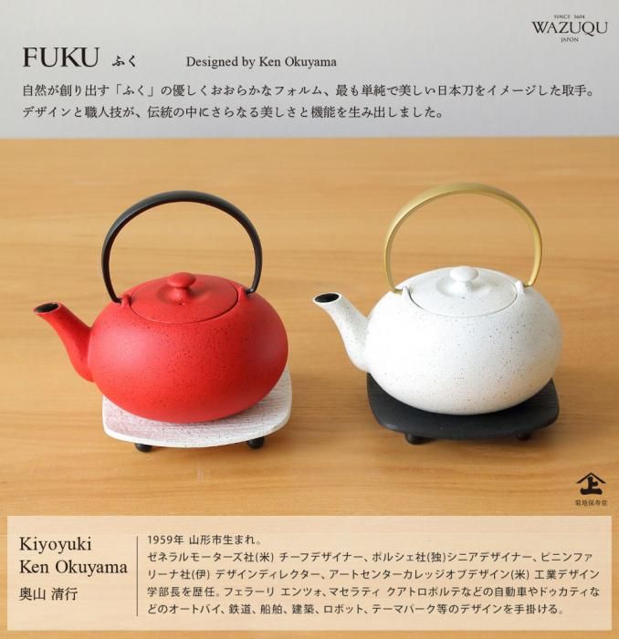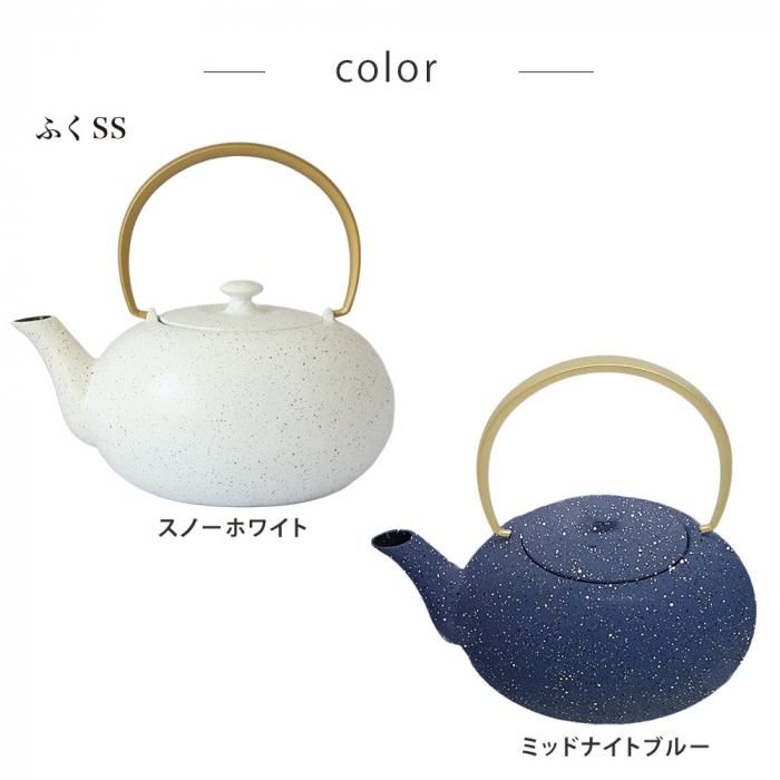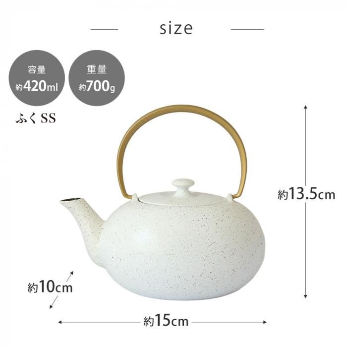 山形鋳物 ワズク ふく SS 金箔 鉄急須 420ml 菊地保寿堂 送料無料自然が創り出す「ふく」の優しくおおらかなフォルム デザインと職人技が 伝統の中にさらなる美しさと機能を生み出しました wc-wazuqu-80008-9 20,350円(税込)0円 在庫スノーホワイト20,350円(税込)在庫なしミッドナイトブルー20,350円(税込)在庫なし SOLD OUT 製品について性能詳細お買い物ガイドクロッカについて自然が創り出す優しくおおらかなフォルムの「ふく」 お茶に適切な温度を保つ鉄素材、付属する茶こしも茶葉からお茶が美味しく抽出されるように設計されています。内側は手作業にて丁寧に琺瑯加工されております。日本茶の急須として、紅茶、中国茶などの茶器としてはもちろん、コーヒードリップ 用のポットとして。現代の生活でも美味しく安全なお湯を沸かし出す鉄瓶を気軽にご利用できるよう作られています。口当たりいい美味しいお湯でお茶やコーヒーをご堪能ください。また茶こし付きなので、お茶漬け用の出汁とりに便利です。 サイズW150×D100×H135mm口径:約63mm 満水容量420ml 重量約700g 材質本体:鋼鉄(外側:焼付塗装・本体内側:ホーロー加工)ツル:アルミ合金茶こし:ステンレス 生産国日本 備考○電子レンジ・食器洗浄器、乾燥機・IH調理器でのご使用はできません。○火にかけてお湯を沸かすことはできません。お湯を注いで急須としてお使いください。 サイズ420ml 550ml(黒) 550ml(白) 600ml